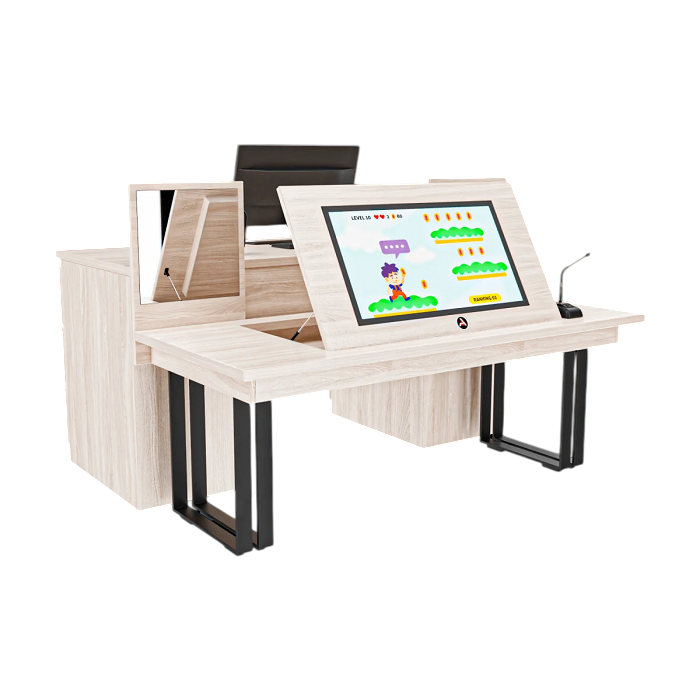 Профессиональный стол логопеда Logo Pro 23,8" с двумя рабочими местами для воспитанника и специалиста помогает стимулировать речевые функции и когнитивные навыки у детей. Это современное оборудование с сенсорным экраном и программным обеспечением для интерактивного обучения. Единственная в своем роде цифровая техника для профессиональной работы с детьми представляет комплект модулей, собранных и настроенных по заданным параметрам.